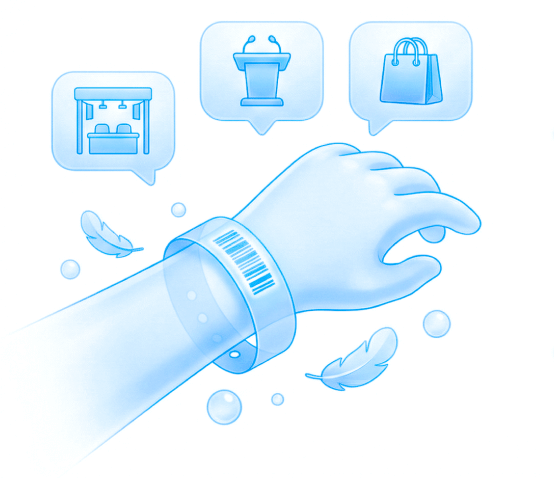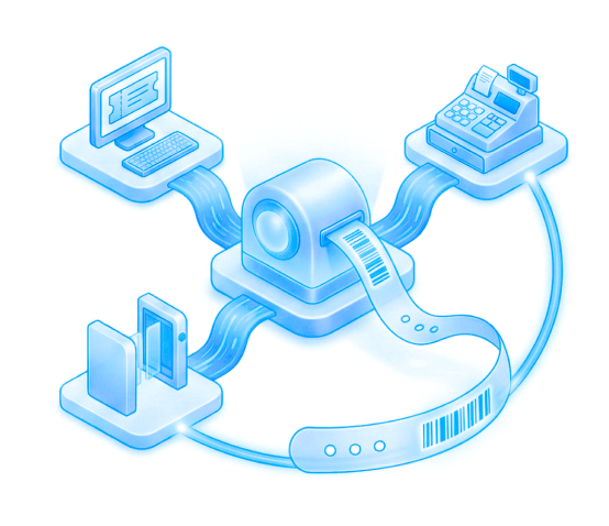 无缝接入现有票务系统、收银POS、闸机系统,实现数据无缝流转。购票后可打印出带,腕带上的二维码可在园内快速识别。